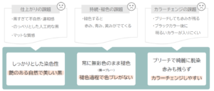 深み・艶・持続性、そしてカラーチェンジのしやすさ。