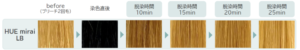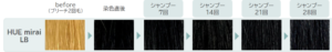 HUE mirai LBの褪色は非常に穏やかで、1か月経っても赤みやブラウンみを感じにくい無彩色のまま